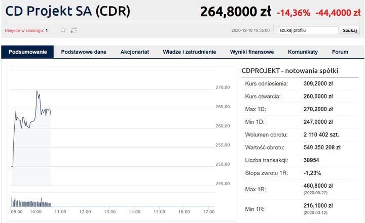 W 2020 roku akcje osiągnęły szczyt wartości, by potem gwałtownie spaść po premierze Cyberpunk 2077 na konsolach. Ta niestabilność pokazała, jak wrażliwa na opinie rynku jest spółka zależna od jednego głównego produktu. Wpływy emocjonalne inwestorów nadal odgrywają dużą rolę w wahan iach notowań.
