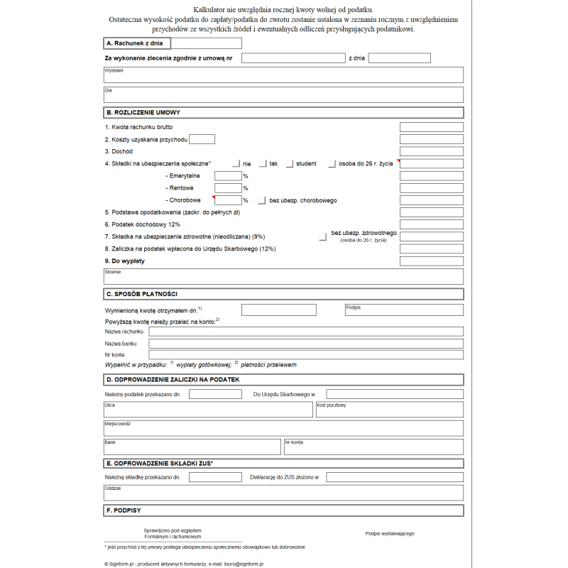 | Termin przekazania | Do dnia 31 stycznia roku następującego po roku podatkowym. Płatnik musi przekazać dokument zleceniobiorcy i skarbowi. |