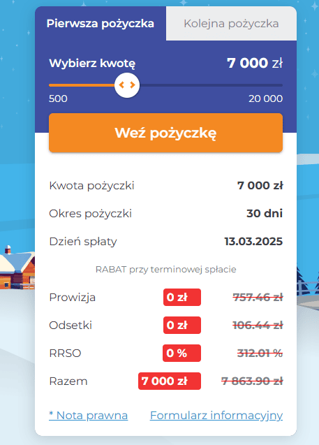 | Wysokość pożyczki | Do 1000–1500 zł dla nowych klientów, bez odsetek przez pierwsze 30 dni. |