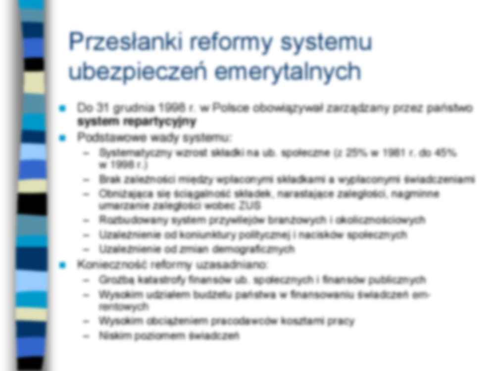 Stary System Emerytalny, funkcjonujący w Polsce przed reformą emerytalną z 1999 roku, był oparty na zasadzie rozdzielczości pokoleń, gdzie aktualnie pracujący płacili składki na rzecz aktualnie emerytowanych. System ten, nazywany również systemem pay-as-you-go, działał w oparciu o zasady ustawy z 1974 roku i był zarządzany przez Zakład Ubezpieczeń Społecznych (ZUS). W jego ramach ubezpieczeni mieli prawo do emerytury lub renty na podstawie ukończonych lat pracy, wieku oraz stażu ubezpieczeniowego, przy czym wysokość świadczeń była uzależniona od przeciętnego wynagrodzenia w gospodarce i liczby lat pracy. Pomimo swej prostoty i powszechności, system ten napotkał na poważne problemy związane z starzeniem się społeczeństwa i malejącą liczbą aktywnych zawodowo w porównaniu do rosnącej liczby emerytów, co doprowadziło do jego restrukturyzacji w ramach reformy 1999 roku.